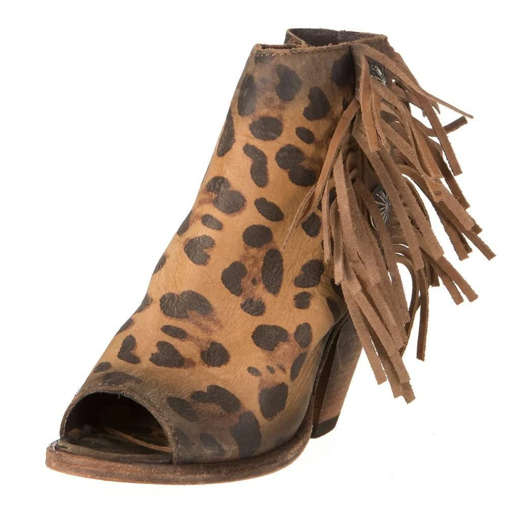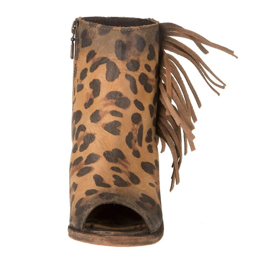 Ladies step out for a fun night out with our tan cheetah print open toe with fringe booties from Liberty Black.